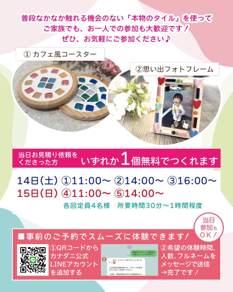 💰 参加費:お見積りご依頼の方はコースター・フォトフレームいずれか1つ無料!